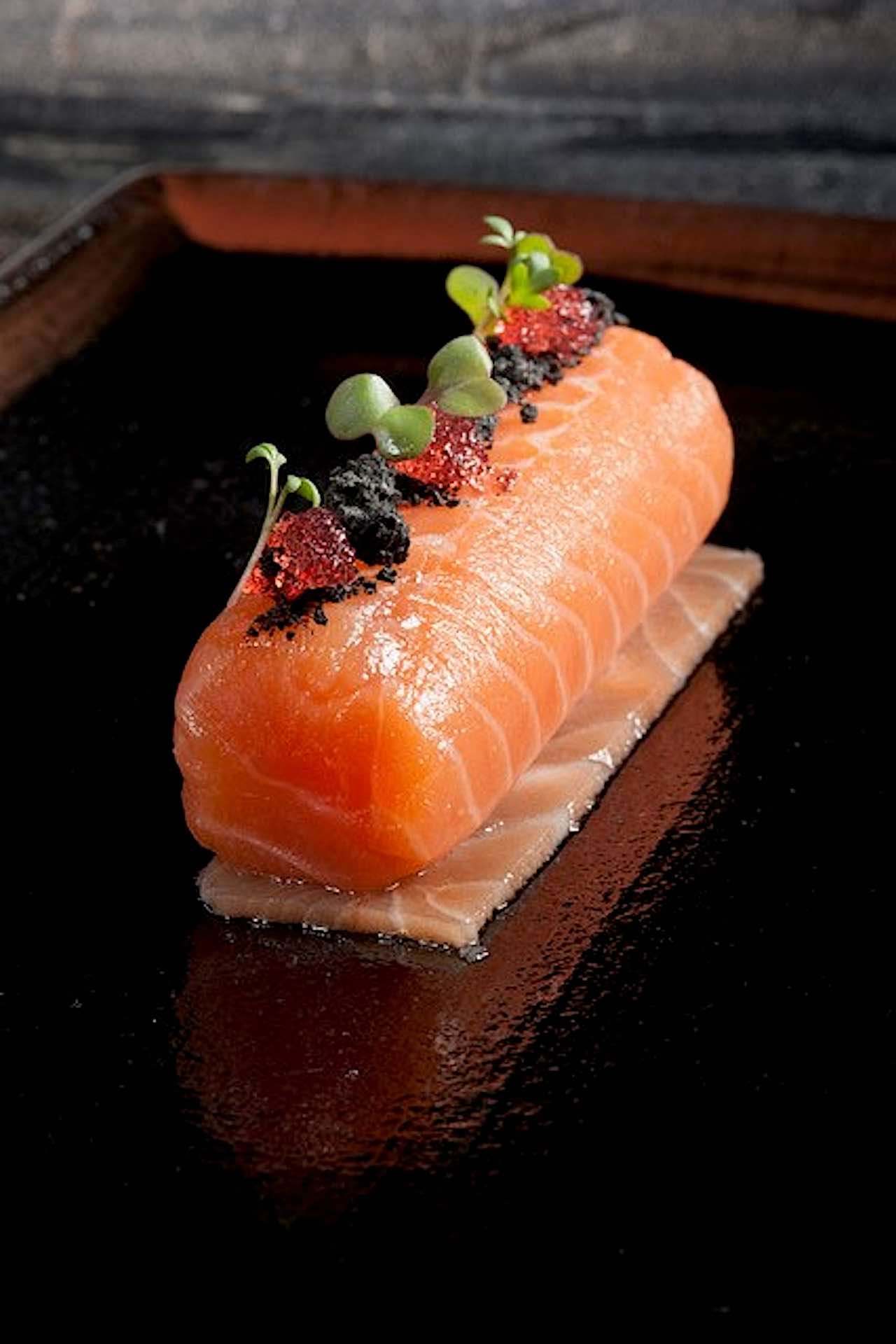 Versare lo zucchero e il sale grosso in un ciotola capiente e mescolare bene. Disporre la trota salmonata in una pirofila e cospargerla con il composto di zucchero e sale. Coprire la pirofila con la pellicola e lasciar riposare la trota salmonata in frigorifero per circa 6 ore. Nel frattempo preparare il pane nero. Versare l’aceto balsamico in una ciotola capiente, aggiungere il carbone vegetale e mescolare fino a quando il carbone vegetale risulterà completamente sciolto. Sbriciolare il pane in cassetta e versarlo nella ciotola con il composto di aceto balsamico e carbone vegetale. Lasciar assorbire tutto il composto. Sistemare il composto ottenuto su una teglia rivestita con carta forno e lasciare asciugare in forno statico a 60° per circa 6 ore. Una volta asciugato lasciarlo raffreddare, versarlo in un mixer e ridurre in polvere. Lavare la trota salmonata sotto acqua corrente e asciugarla bene. Mettere in una casseruola la segatura di faggio, qualche rametto di rosmarino, foglie di alloro e di salvia spezzettate grossolanamente e gli spicchi d’aglio schiacciati, mescolare bene e bruciare il tutto con un cannello. Sistemare la casseruola sul fondo del forno. Mettere la trota salmonata su una griglia, porla nella parte più alta del forno e lasciarla affumicare per 2 ore. Nel frattempo preparare la gelatina di lamponi. In una ciotola mescolare lo zucchero con l’agar agar. Versare l’aceto in una casseruola e far scaldare per pochi minuti. Aggiungere il composto di zucchero e agar agar e far sciogliere il composto a fuoco lento mescolando con una frusta. Lasciar bollire per alcuni istanti. Versare il liquido ottenuto in una placchetta e lasciar rassodare per circa 1 ora a temperatura ambiente. Trascorso il tempo con l’aiuto di una frusta rendere la gelatina di lamponi nuovamente fluida. Versarla poi in un sac-à-poche e metterla in frigorifero. Terminata l’affumicatura riprendere la trota salmonata, tagliare un trancio e passare poi il coltello tra la carne e la pelle per eliminare quest’ultima. Ricavare dai tranci ottenuti dei rettangoli regolari e avvolgerli uno a uno all’interno della pellicola rotolandoli sul piano da lavoro per dargli una forma cilindrica. Lasciar riposare in frigorifero per circa 1 ora. Trascorso il tempo disporre i lingotti di trota salmonata nei piatti, cospargere sulla superficie dei lingotti di trota salmonata un po’ di pane nero e qualche goccia di gelatina di lamponi. Completare con i germogli e servire.