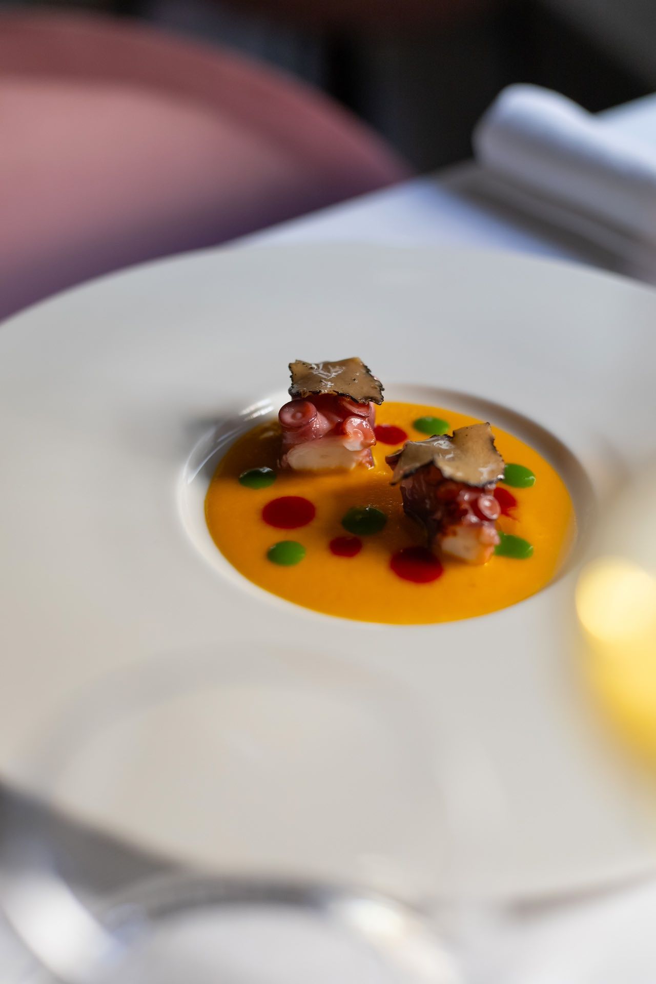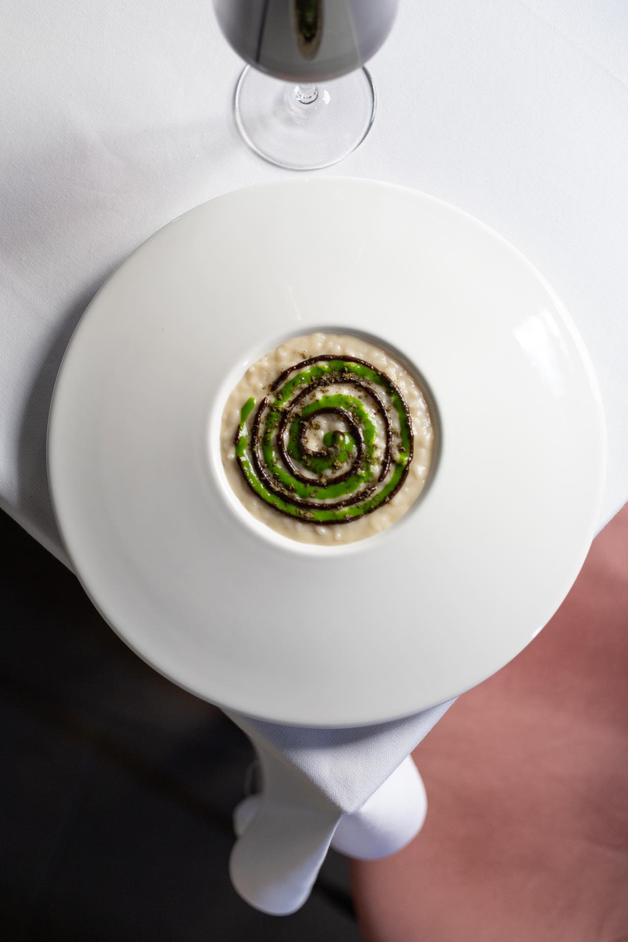 Particolarmente interessanti i risotti come Fungo porcino, prezzemolo e bus di vitello, Crema di barbabietola, salsa di gorgonzola e terra di olive taggiasche, Gambero rosso di Mazara del Vallo, prezzemolo e salvia, Branzino, arancia e lapsang souchong.