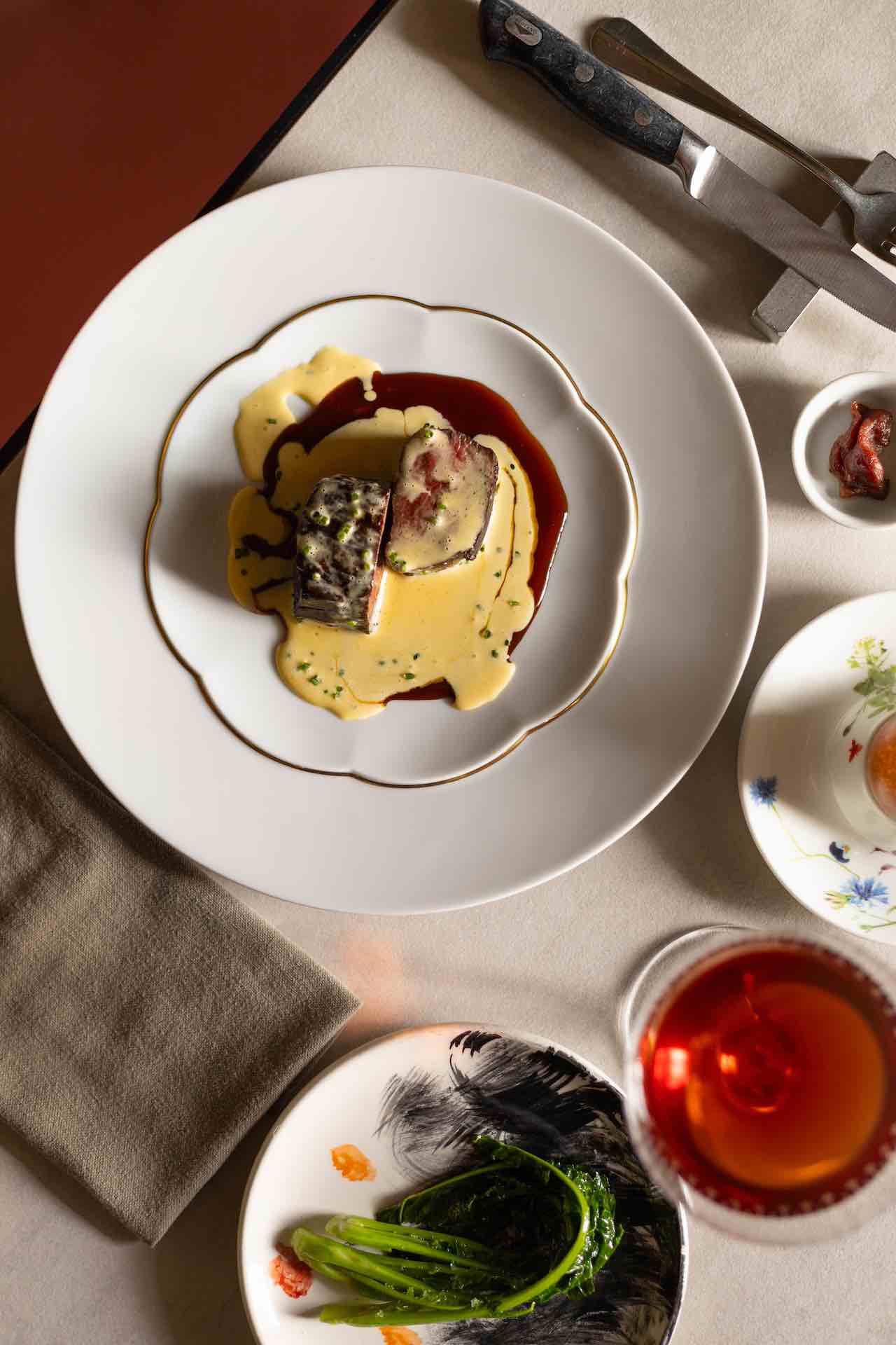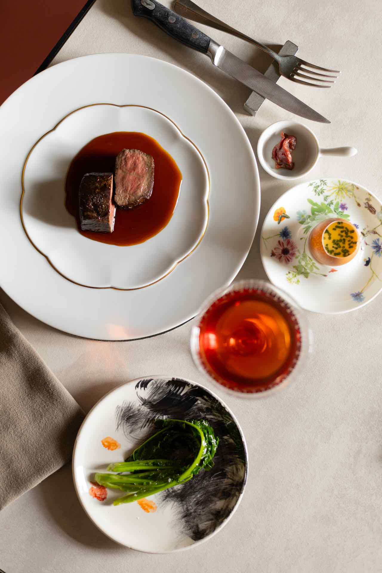 Un secondo di cacciagione elegante e sofisticato: Cervo, whisky e tabacco – sella di cervo cruda e cotta, il suo fondo al whisky Laphroaig, bernese al sigaro e broccolo fiolaro.
