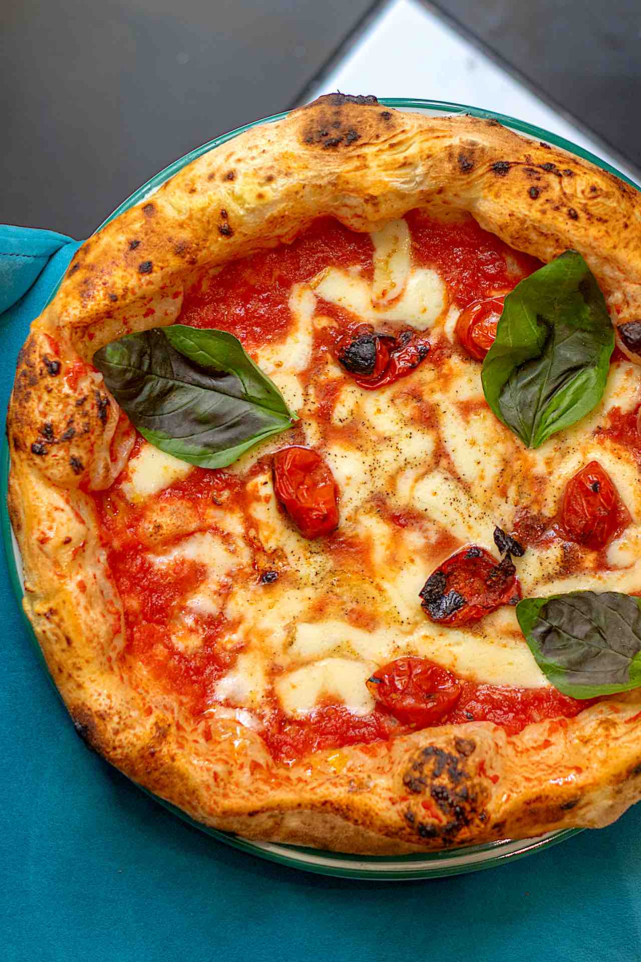 In una ciotola capiente far sciogliere il lievito in 440ml di acqua fredda. Aggiungere la farina poco alla volta e amalgamare il tutto fino a ottenere un composto liscio e omogeneo. Coprire e lasciar riposare in frigorifero per circa 20 ore. Trascorso il tempo, riprende il composto, aggiungere l’acqua rimanente e il sale e lavorare il tutto energicamente fino a ottenere un impasto liscio e omogeneo. Dividere l’impasto in panetti di circa 280g, disporli su una teglia precedentemente oleata, coprirli e lasciarli lievitare a temperatura ambiente per 3-4 ore. Sistemare i pomodorini in una teglia rivestita con carta da forno e farli cuocere in forno a 180° per circa un’ora. Stendere delicatamente il panetto, lasciando il bordo un pò più alto. Condire con il pomodoro San Marzano schiacciato a mano, la provola a tocchetti, il pepe nero macinato fresco e i pomodorini al forno. Far cuocere in forno a 250° per 6-8 minuti o fino a quando il cornicione non risulti ben dorato. Completare con un filo d’olio extravergine di oliva, qualche foglioline di basilico e servire.