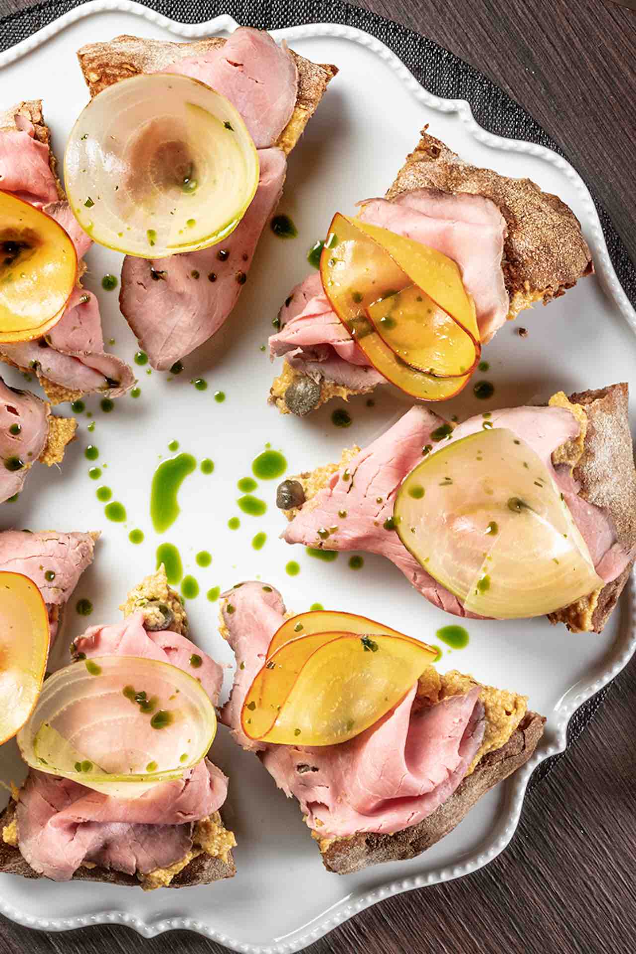 Tagliare la pizza in otto fette. Con una sac à poche adagiare sopra ogni fetta la salsa tonnata. Aggiungere le fette di vitello, le rape marinata e l’emulsione al prezzemolo. Completare con i capperi e le erbe aromatiche.